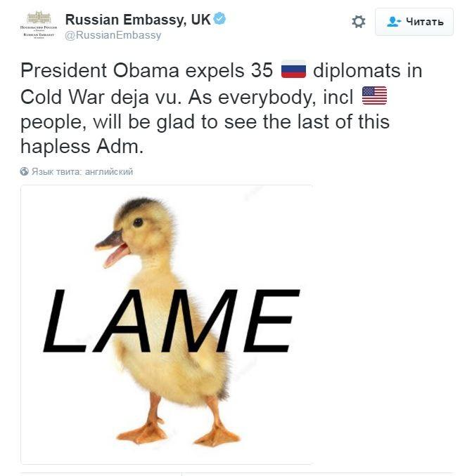 «Президент Обама высылает 35 дипломатов, возвращаясь к холодной войне. Как и все, включая народ США, будем рады увидеть уход этой незадачливой администрации».