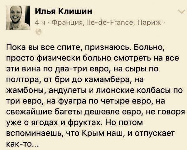 А потом вспомнишь, что КРЫМНАШ а ВАМШИШ, и благодаря этому, у нас на прилавки возвращаются ГОСТы и натурпродукт... и отпускает как-то...