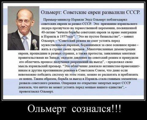 Я понимаю, Михаил, что у Вас проблема с пониманием текста. Ольмерт имел в виду борьбу советских евреев (в 1957-м году !) за право свободного выезда из страны. Какое отношение Ольмерт или ВЫЕХАВШИЕ из СССР евреи имеют к развалу СССР, последовавшему через 34 года ??? Или Вам это это абсолютно неважно ? Ведь Вы просто нацист, животный юдофоб, и Вам абсолютно всё равно за что упрекать евреев, угадал, болезный Вы наш ?