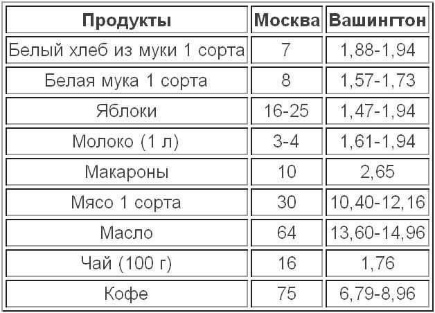 Конкретизировал новые цены и пояса приказ министра торговли [17]. Для справки, средний размер заработной платы в стране тогда составлял 500-550 рублей в месяц (подробнее cм. 18), можно на досуге заняться расчётами. Собственные расчёты уже летом 1948 провели финансисты посольства США в СССР – они сравнили стоимость продуктов в столицах двух государств (Москве и Вашингтоне), при пересчёте доллара на рубль приняв официальный курс 8 руб. за бакс. Получилось у них вот что [2, с. 18]: (см. рис.).