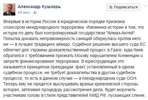 — Скорее, подобное решение следует отнести к еще одному антироссийскому демаршу, вписывающемуся в целый ряд аналогичных решений и легитимирующий санкции против России. Само по себе, решение Суда вряд ли вызовет серьезные последствия, но совокупный эффект от медийных, политических, юридических и т. п. кампаний по перекладыванию вины и ответственности с Украины на Россию может наносить урон интересам России.
