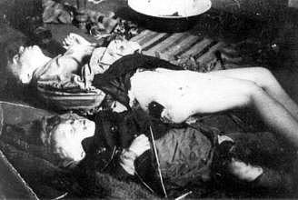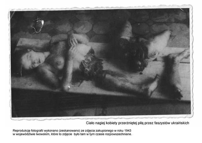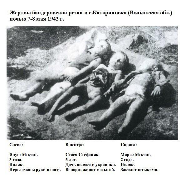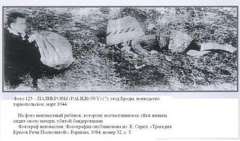 12 марта 1944 г., банда боевиков УПА и 4-й полицейский полк дивизии СС «Галичина» совместно напали на польское село Паликровы (бывшее львовское воеводство, ныне - территория Польши). Это было село со смешанным населением, примерно 70% поляков, 30% украинцев. Повыгоняв жителей из домов, полицаи и бандеровцы начали сортировать их по национальному признаку. После отделения поляков – их расстреляли из пулеметов. Погибло 365 человек, в основном женщины и дети. На снимке ниже: Паликровы, март 1944 г., ребенок рядом с матерью . Мать была убита во время резни, устроенной УПА и карателями из украинской дивизии СС "Галичина".