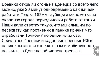 Итак, что нам докладывают наши там фронтовые корреспонденты? Принудительно мобилизованные Киевом, обманутые фашистской пропагандой хохлы, в нарушение минских соглашений подтянули к линии соприкосновения сторон танки, «Грады» и «Ураганы». И хреначат из них по школам, детсадам и поликлиникам. Короче, бандюки ровняют с землёй Донецк. Все слышали? Донецк!