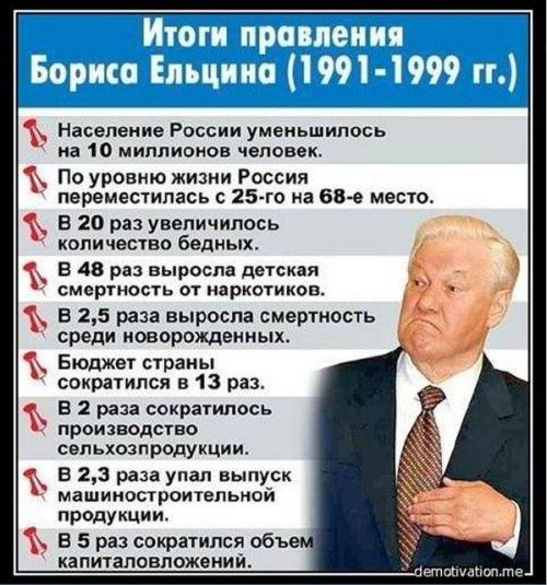 В общем, нет ни одного жизненно важного показателя, который бы не показал катастрофического падения вследствие прихода к власти Бориса Ельцина, человека, которому нынешний правящий режим, как продолжатель и наследник ставит памятники и центры памяти:
