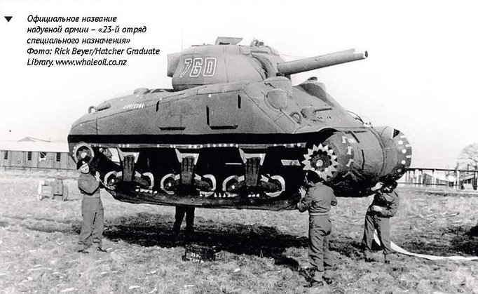 Подразделение вооружили арсеналом из надувных муляжей военной техники, которые на расстоянии невозможно было отличить от настоящего оружия, и все это «шапито» требовалось правдоподобно замаскировать на местности. Это была ювелирная работа, ведь, с одной стороны, разведке противника не полагалось раскрыть обман, а с другой – она все же должна была обнаружить «технику» и доложить о ней своему командованию. В нужный момент через огромные громкоговорители проигрывались аудиозаписи, которые имитировали звуки движущегося и стреляющего вооружения, создавая реалистичное подобие работы настоящей техники. Эффект был потрясающий: немецкая разведка обнаруживала боевые подразделения в тех местах, где еще полдня назад ничего не было!