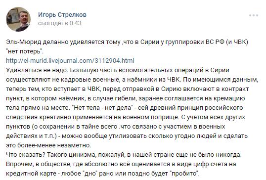 Гиркин написал о Сирии — но если контракты на сжигание тел убитых наемников действуют в Сирии, то можно предположить, что и во время войны в Украине правила действуют те же самые.