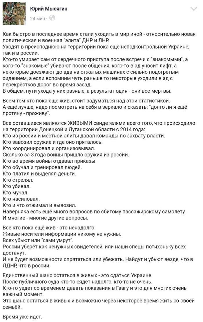 «В 6:12, в результате террористического акта погиб командир батальона «Сомали» полковник Михаил Толстых, известный как Гиви. Об этом источник Лайфа в Минобороны ДНР.