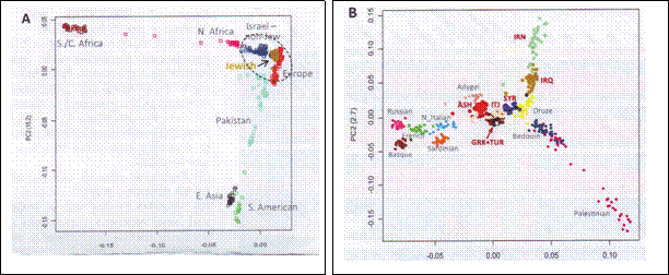 • Справа - вишневый цвет и более крупный шрифт отмечает еврейские группы: ASH – Ашкенази, ITJ - Итальянские евреи, GRK + TUR - Греческие + турецкие, SYR – Сирийские, IRQ – Иракские, IRN – Иранские