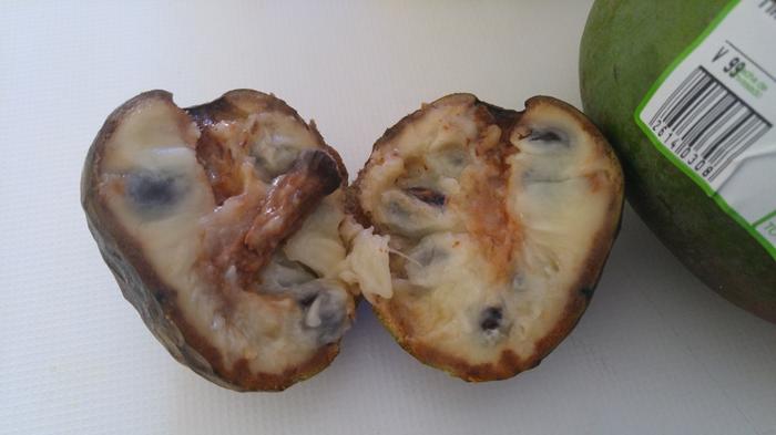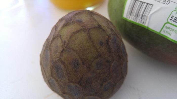самое вкусное находится внутри — это белая, очень сочная мякоть, напоминающая сливочный крем, с крупными черными семенами, похожими на бобы. По вкусу черимойя напоминает сочетание банана, ананаса и клубники. Кожура и семечки в пищу не употребляются.