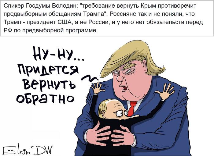 О том, что в России поспешно решили, что Трамп - пророссийский лидер, заявил сегодня "Интерфаксу" и председатель комитета Госдумы по международным делам Леонид Слуцкий. "Пресс-секретарь Белого дома сделал заявление о том, что Россия должна вернуть Крым. Мы слишком рано решили, при безусловной нашей симпатии к конструктивной риторике президента Трампа, что он вроде бы какой-то пророссийский, он - проамериканский. Он просто воспользовался на определенном этапе настроениями одноэтажной Америки", - сказал Слуцкий, отметив, что раскрученный в США маховик антироссийских настроений остановить очень трудно. А так как идея присоединения Крыма к России идет вразрез с настроениями более чем 90% политического истеблишмента, то и от Трампа не стоит ожидать поддержки сохранения Крыма и Севастополя в составе РФ.