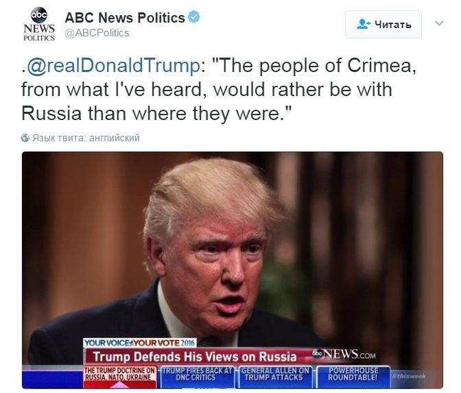 Британская газета independent подчеркивает, что новая позиция Трампа не соответствует тому, о чем он говорил ранее. В своем интервью с Джорджу Стефанопулосу для телеканала ABC в прошлом году, Трамп сказал следующее: "Насколько я знаю, народ Крыма хотел бы быть с Россией, а не там, где они были (прежде). И это тоже надо рассмотреть"