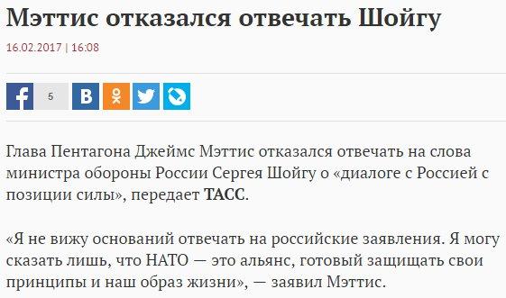 В Минобороны России ожидают комментариев американской стороны по поводу заявления главы Пентагона Джеймса Мэттиса о намерении вести диалог с Москвой «с позиции силы». Об этом в четверг, 16 февраля, заявил глава российского военного ведомства Сергей Шойгу, передает «Интерфакс».