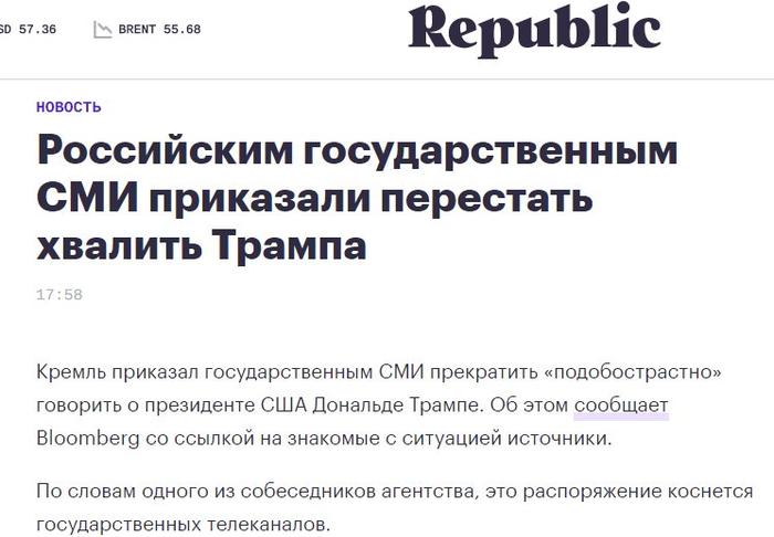 О существовании подобного распоряжения для госканалов также рассказывает в колонке для Deutsche Welle Константин Эггерт. По его данным, холдинг ВГТРК, куда входит в том числе телеканал «Россия», получил указание, суть которого «сводится к короткой фразе: “Трампа больше нет”».