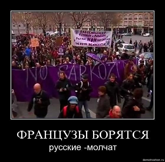 Вы как всегда угодили в самую, самую... "Французы борутся, русские молчат." Ладно на улицу выходить боязно, дубинкой милицейской получить вдоль хребта, здесь на портале-то чего боятся?