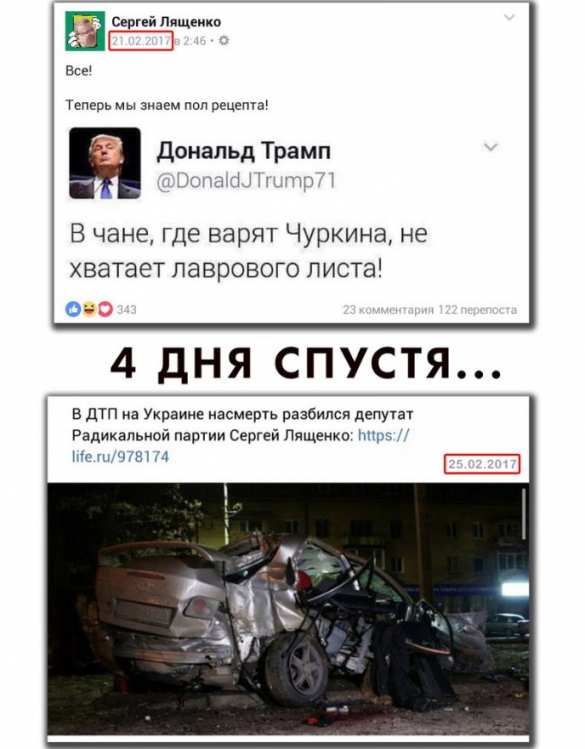 Депутат Днепропетровского областного совета от Радикальной партии Украины Сергей Лященко, поглумившийся над смертью постпреда РФ при ООН Виталия Чуркина 20 февраля, погиб в ДТП в ночь на 24 февраля. Об этом сообщили местные СМИ.