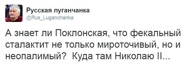 Госпожа Поклонская, как её пытаются выставить некой искренней чистотой, на самом деле тут проблема умственного и интеллектуального развития, проблема психики. И всё это наверняка имеет место быть с раннего детства, если не с рождения. Человек со всей очевидностью, явно умственно неполноценен. Вот над этим действительно смеяться не стоит, учитывая при этом ещё, что она занимала и занимает довольно высокие должности во власти.