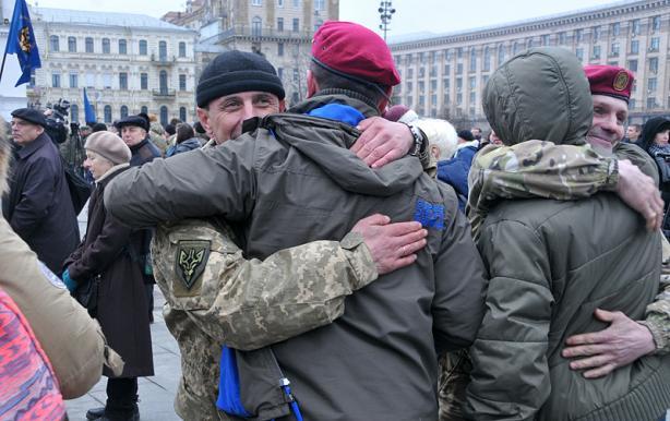 Возле стелы Независимости в центре украинской столицы собрались ветераны АТО, а также бойцы Батальона оперативного назначения имени генерала Сергея Кульчицкого Национальной гвардии Украины.
