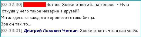Надеюсь - Дима увидит наши комментарии и поймёт, что мы, его друзья или просто единомышленники, важнее, чем какие-то модеры и защищаемые ими ничтожества, которые сейчас пляшут от радости, что выжили из МП ещё одного хорошего человека. А вот хрен им!