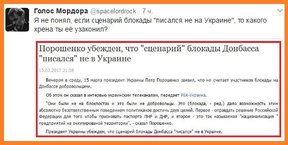 По своей сути, предложение Порошенко синхронизировано с действиями банд Семенченко — так называемых «блокираторов». Что ставит вопрос о полной управляемости этого процесса из Киева. Если же учесть аналогичные и тоже совпадающие по времени действия самих ДНР-ЛНР по созданию кордона со своей стороны (естественно, что говоря ДНР-ЛНР, мы понимаем соответствующую курирующую структуру из Кремля — не сами же Захарченко и Плотницкий будут придумывать и реализовывать такого рода мероприятия) — в общем, налицо дружная и согласованная работа лучшего выбора украинского народа и его дорогого партнера из Кремля.