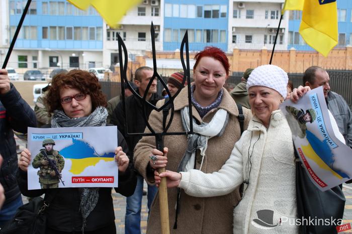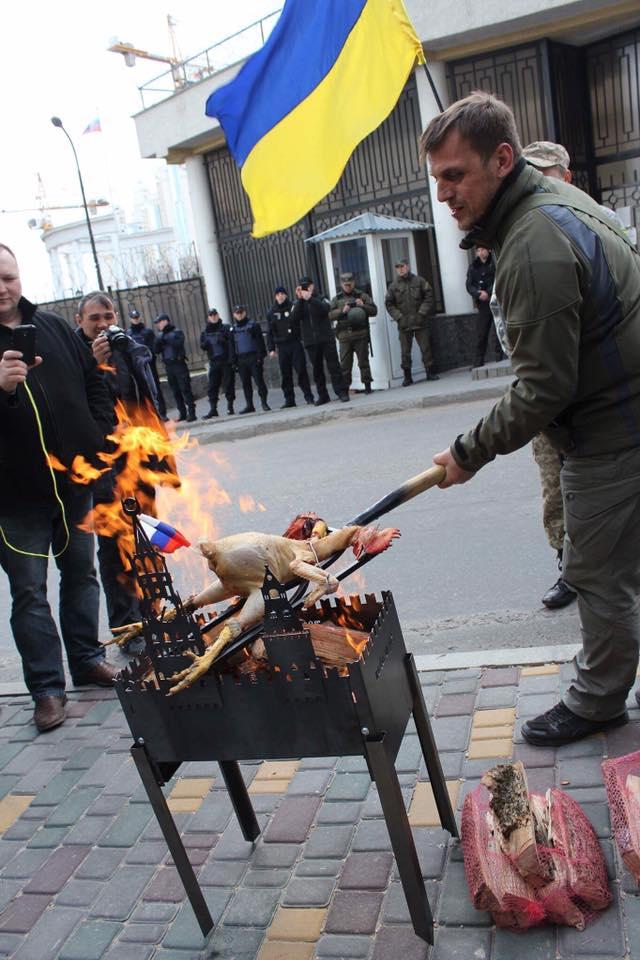 Вчера, лицезреть дикие пляски голодных патриотов пришлось сотрудникам консульства РФ в Одессе. Группа из 50 националистов устроили акцию у стен представительства, приуроченную к годовщине присоединения Крыма к России. Поначалу националисты вели себя более или менее мирно. Негласный инициатор «шоу», глава местного филиала Автомайдана Евгений Резвушкин установил у входа в консульство мангал с изображениями башен Кремля и принялся жарить петуха. Свой «мудрёный» посыл он несколько раз озвучил несведущим прохожим.
