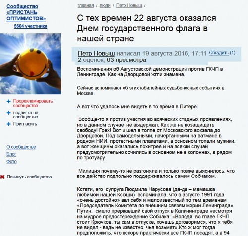 Кстати, его супруга Людмила Нарусова (да-да – мамашка любимой нашей Ксюши) вспоминала, что в августе 1991 года «очень достойно» вел себя и малоизвестный по тем временам «Председатель Комитета по внешним связям мэрии Ленинграда», смело прервавший свой отпуск в Калининграде несмотря на мудрое предостереждение Собчака: «Володя, во главе ГКЧП стоит Крючков, ты сам в отпуске, хочешь договоримся, что я тебя не видел,- ведь не известно, чья возьмет».Кто ж мог тогда предположить, что вскоре практически все ГКЧП посадят, а в 94 досрочно реабилитируют.