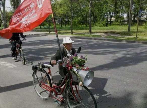 Он вышел перед строем вооруженных нацгвардейцев с теми советскими и российскими флагами, которые у него были. И пусть это всего лишь пакет Компартии Украины и мастерка от спортивного костюма, с флагами мужчина мог просто не дойти до места марша. Но он смело поднял символ СССР, символ, который был начертан на знамени Победы, а на спине у героического деда красовалась надпись «Россия».