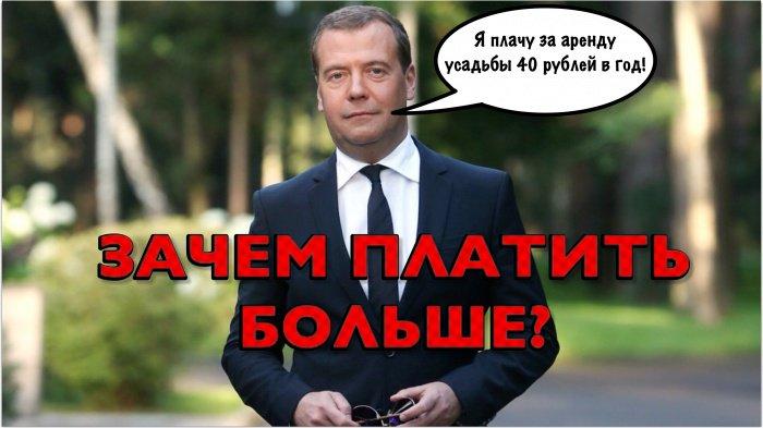 Премьер-министр России Дмитрий Медведев «получил» в аренду участок земли в Плесе в 41 млн квадратных метров за 39 рублей 32 копейки в год". По цене буханки хлеба. Что хотят, то и творят. И почему-то только в свое удовольствие, не исполняя минимальные обязанности по государственному управлению. Даже не знают, что означает управление, хотя десятилетия пердят своим невежеством на высоких креслах.