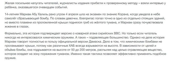 ЗЫ: Официально химическое оружие из Сирии было вывезено и уничтожено, о чем в свое время пафосно отчитался Обама, однако, речь идет только о том оружии, которое на 2014-й год контролировал Асад. А то, что контролировали боевики, никто никуда не вывозил, так же как никто не требовал закрытия подпольных цехов и лабораторий по производству хим.оружия.
