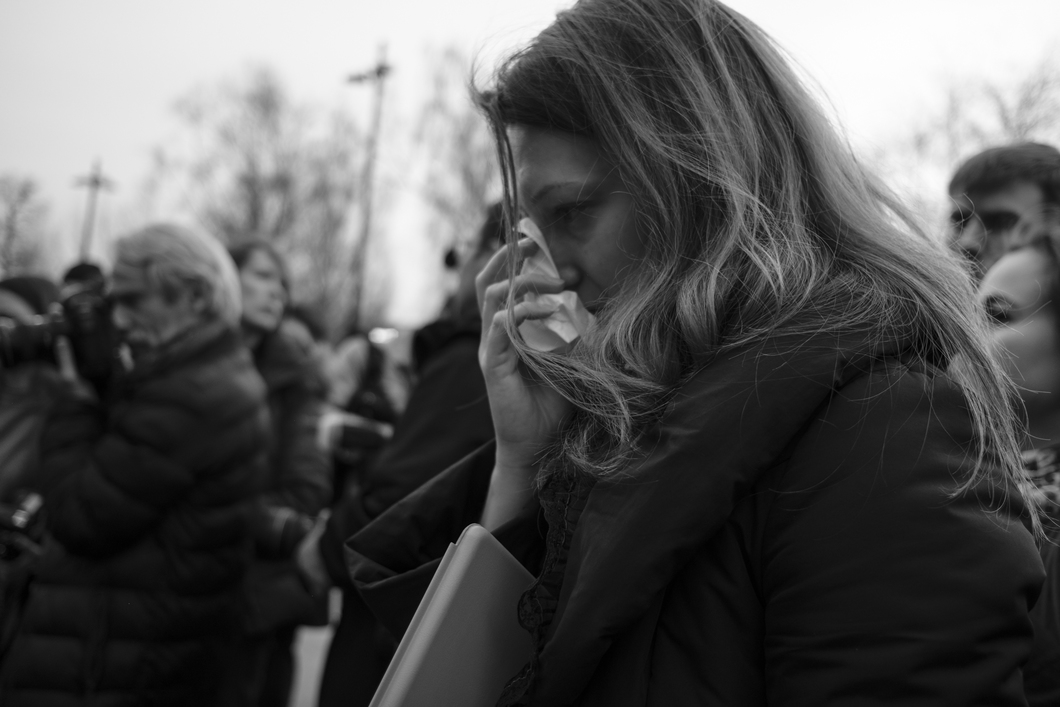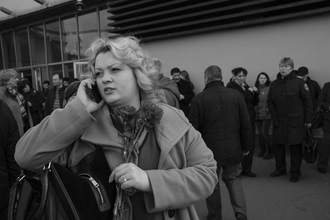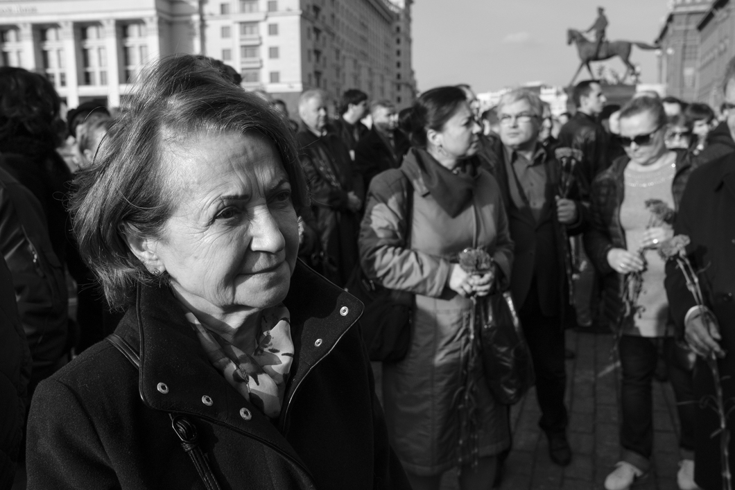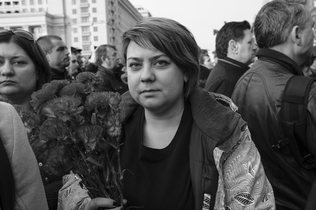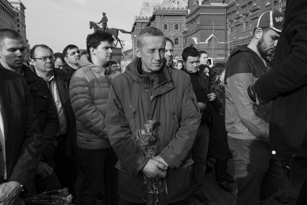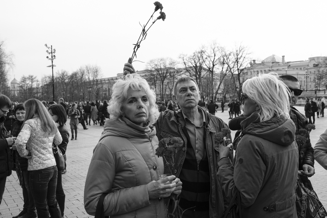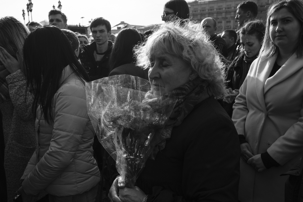 В толпе стоят два парня, они общаются друг с другом, озираются по сторонам. У одного из них в руках розы. Они пришли сюда сами. Один из них, Павел, ему 23 года, говорит, что политические партии просто везде засветиться хотят, но акция эта неполитическая. А они сами пришли сюда как на акцию памяти: «У нас много друзей в Питере. Мы знаем, каково это. И мы знаем, что митинги — это опасно. Но что делать? Бояться теперь всего? Не нужно это».