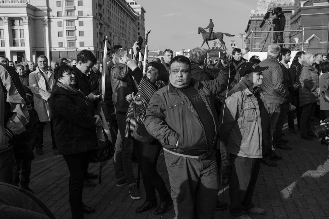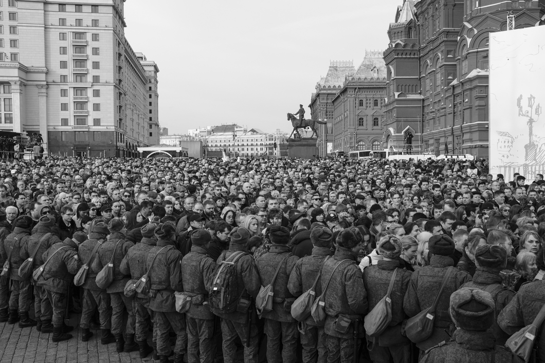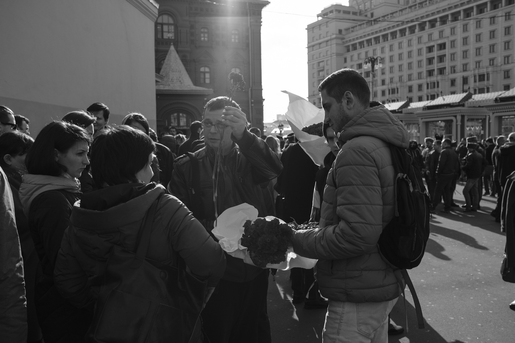 По дороге к Манежке встречаю ребят в форме МЧС России, военных с одетой поверх футболкой «#ПитерМыСТобой». Все они идут организованно с красными цветами. Большое представительство у НОДа — около 30 человек стоят в лентах, шарфах и с флагами. У женщины в военной пилотке в руках табличка — «Россия пойдет до конца, защищая свои интересы (с) В. Путин».
