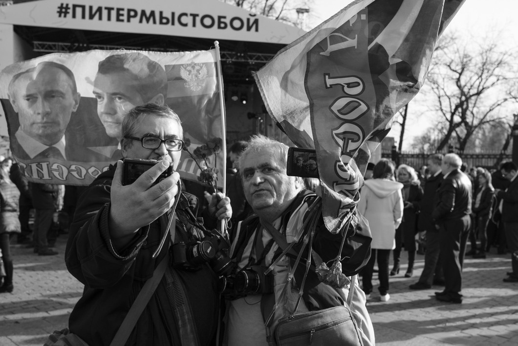 Напротив сцены фотографируются молодые девушки. Особенно во время выступления Валерии они стараются сделать красивое улыбчивое селфи. Мужчина с гвоздиками в обеих руках в такт музыке машет ими в разные стороны. Женщины с черной лентой на сумке и айфоном в чехле с Путиным снимает на видео все вокруг.