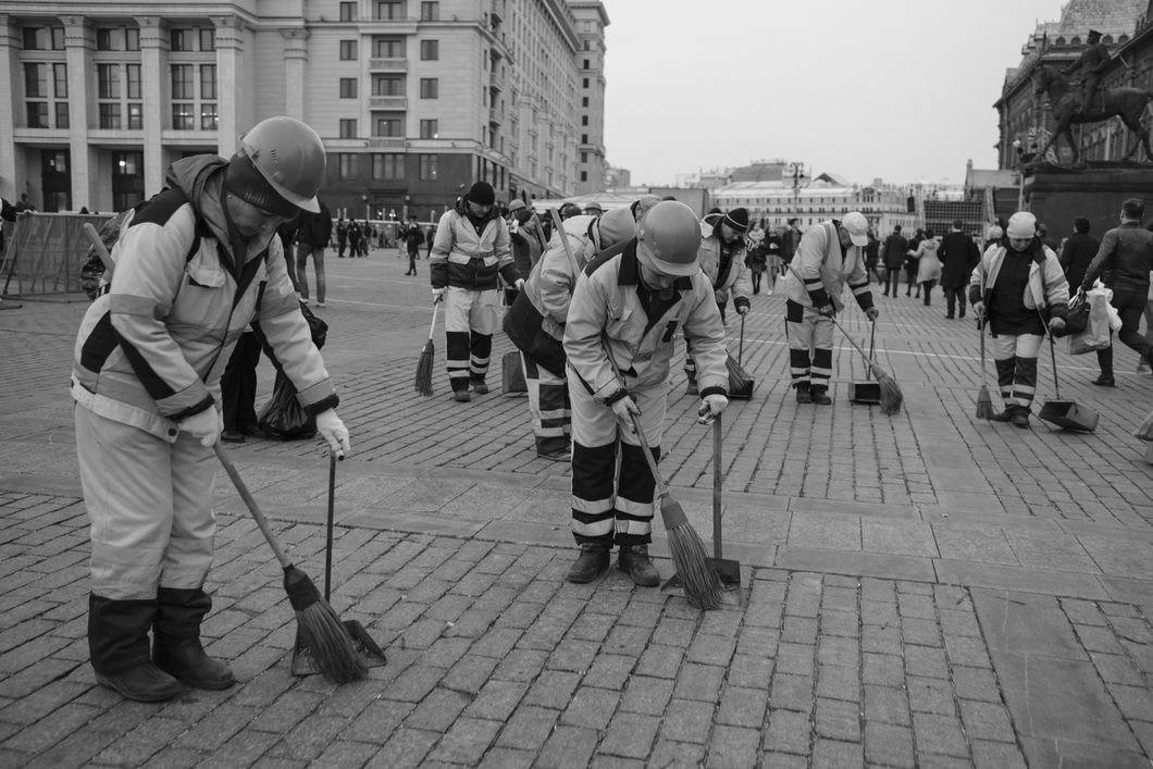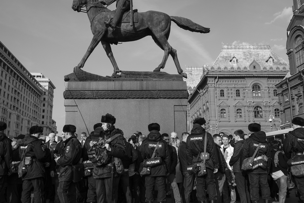 Практически толпой мы направляемся к Манежке. Правда, не напрямик, а через Театральную площадь — все перекрыто.