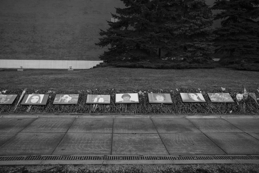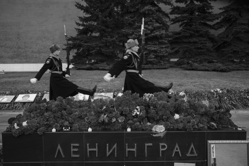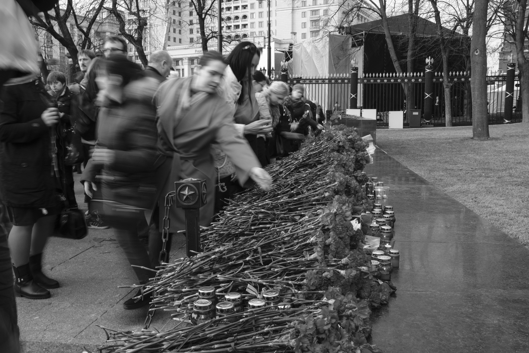 В 7 вечера у Вечного огня море красных цветов. Люди ставят маленькие свечи и лампадки. Рядом с толпой, уже на «выходе», стоит женщина, подняв над собой плакат «Знает каждый гражданин, кто террорист номер один (про ИГИЛ*)». Мужчина в зеленой манишке, отвечающий за то, чтобы правильно направлять людей, делает женщине замечание. Она просит не его мешать акции на «собрании против терроризма».