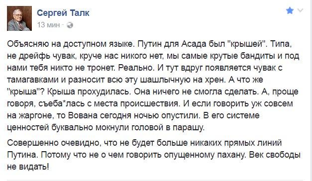 А почему бы не ввалить "калибрами" по пиндостанским военным, которые убивают сотни мирных жителей Мосула? Интересно, чем дело закончится? Нам всё равно терять нечего - экономика в клочья, сусликов доели...