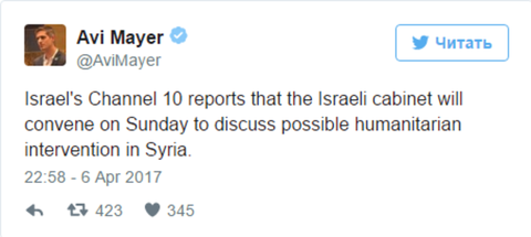 Как передает израильский Channel 10, кабинетом министров будет рассмотрена "лишь необходимость начала гуманитарной интервенции в Сирию", а речь "о какой-либо военной агрессии не идет". Отмечается, что заседание правительства по сирийскому вопросу пройдет 9 апреля.