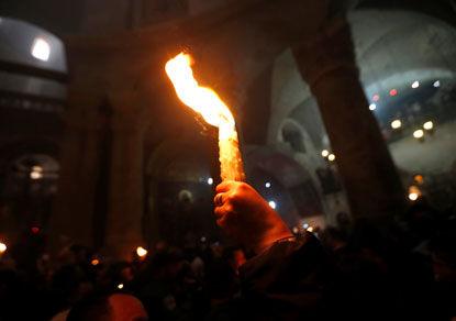 Священнослужитель отметил, что до 2002 года огонь "сходил" в разное время, однако после того как российский канал НТВ выкупил эксклюзивные права на прямую трансляцию из храма Гроба Господня, он сходит точно с 14:03 до 14:16 дня (по Израилю).