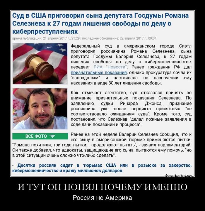 Как известно, сын депутата от ЛДПР Валерия Селезнёва Роман Селезнёв получил в США 27 лет тюрьмы за взлом компьютерных сетей и кражу личных данных.