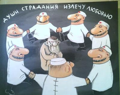 — Я рисую, глядя в зеркало, корчу рожи. Все мои картины — большой автопортрет. Плюс фантазия… Картин у меня около двухсот. Ещё много графики, нарисованной карандашом для Интернета. Часто встречаются репродукции, распечатки моих картинок. В офисах, конторах их любят вешать. Такое цитирование душу, несомненно, греет…