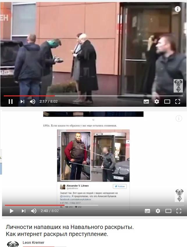 К активисту №2, обливальщику зеленкой , вопросы юридически есть, статья УК о причинении вреда имеется, поскольку Навальному оказывали помощь в больнице и зафиксировали ущерб для глаза. Но для суда похожая одежда не доказательство. Осудить активиста на основе этих скриншотов невозможно. Если только сам злоумышленник чистосердечно не признается))