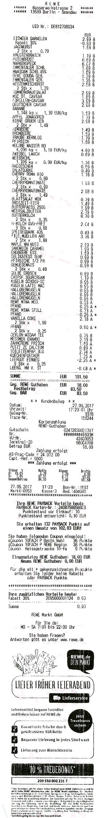 К празднику закупаюсь обычно ещё дороже, с мясом для гриля и спиртным, порядка 150 Евро за полную тележку выходит. Но мы на еде не экономим - в холодильнике шампанское, шампиньоны, икра красная и чёрная , 3-х сортов, бананы, груши. орехи и т.п - да на чеке всё видно, если по немецки понимаете. Внуки мелкие приходят с ночевкой, хочется и их побаловать.