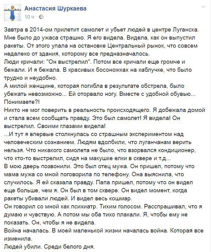 Глава миссии ООН по правам человека на Украине Фиона Фрейзер считает необходимым провести расследование авиаудара со стороны украинских силовиков по центру Луганска летом 2014 года. Соответствующее заявления он сделала во время поездки в провозглашенную Луганскую народную республику (ЛНР). В ходе встречи с уполномоченным представителем ЛНР на минских переговорах Владиславом Дейнего и руководителем рабочей группы по обмену пленных Ольгой Кобцевой она подчеркнула, что факт обстрела был отдельно отмечен в докладе ООН. "В нашем отчете по ответственности за убийства, которые происходили в ходе конфликта, мы также отобразили этот случай (обстрел киевскими силовиками центра Луганска - прим.