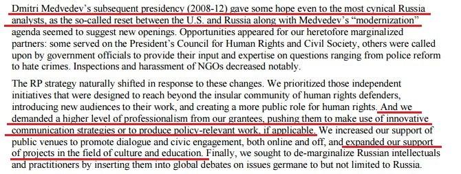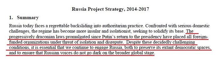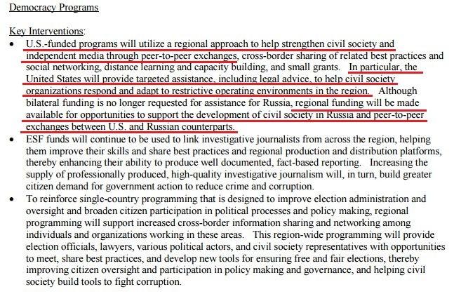 Согласно этому документу, Соединенные Штаты, пользуясь невозможностью прямого финансирования российских СМИ и НКО в виду принятия поправок в закон «О некоммерческих организациях», которые подразумевают внесение поддерживаемых иностранными правительствами организаций в реестр «иностранных агентов», будут прибегать к новым способам «поддержки».