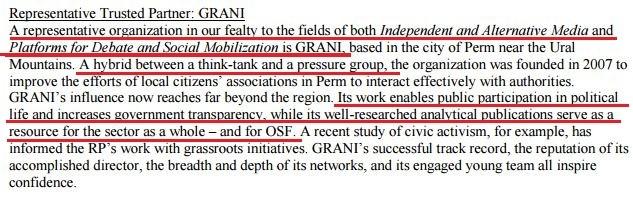 В качестве примера успешной реализации своих инициатив по формированию альтернативных медиа и создания платформ для мобилизации гражданского общества в документах «Открытого общества» наряду с такими «правозащитными» гигантами, как «Мемориал», фигурируют и малоизвестные структуры, вроде организации «Грани» в Перми.