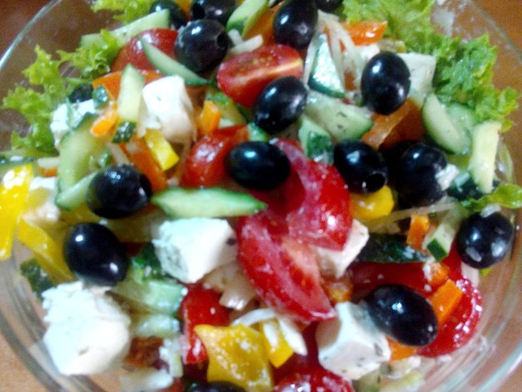 накрошу помидорок, перцев, залью это дело смесью раст.масла, соевого соуса, горчички слегонца, сверху феты и базилика...
