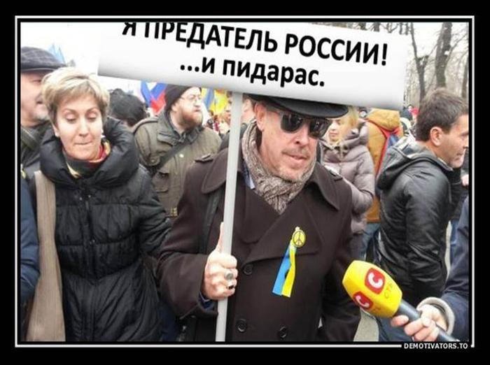 "Наши" либерасты (с вами вместе) - это ни на что не способные, вечно ноющие и всегда всем недовольные моральные уроды. А чем вы живете? Чем зарабатываете на хлеб насущный? И почему народ должен пойти за вами, если все, что он (народ) видит, это постоянный треп типа "как все плохо" и нет ни одного реального предложения, как улучшить жизнь народа России? Кстати, чей Крым? А бандера и шухевич фашисты и бандиты или это ваши "херои"? Пока в России нет нормальной, вменяемой оппозиции, нет и не предвидится. Вы - не оппозиция. Вы дерьмовые либерасты.