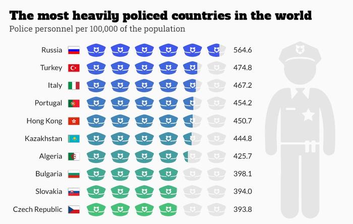 Россия была признана самым полицейским государством в мире по соотношению количества представителей правоохранительных органов на 100 тысяч населения. Рейтинг был составлен на основе статистических данных управления ООН по наркотикам и преступности.