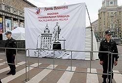 Власть к акциям оппозиции на Триумфальной готовится загодя. Уже вчера  днем площадь вокруг памятника Маяковскому была оцеплена милицией,  ставшей для центра Москвы таким же привычным антуражем, как бутики и  дорогие иномарки.  Возле известного ресторана «Горки», издали больше походившего вчера на  милицейскую столовую, наблюдалось порядка десяти автобусов со стражами  порядка. Некоторые из них спали, ожидая начала служебной вахты,  остальные прятались от вернувшейся в Москву жары. Тем временем на сцене,  возведенной на крыльце Концертного зала имени Чайковского, под большим  полотном со словами «Молодая гвардия», заслонившим афиши с портретами  Юрия Башмета, молодежь настраивала звук. «Двадцать восемь, двадцать  девять, двадцать десять», – считал человек у микрофона, и голос его был  слышен далеко за пределами Тверской.