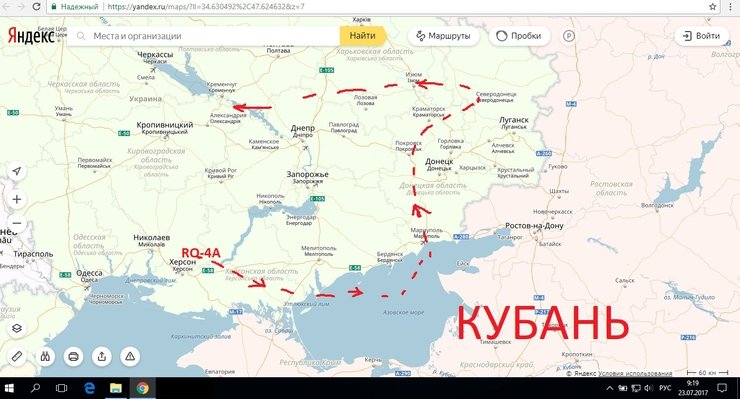 Вы уже знаете, что 16 июля 2017 года имел место длительный разведывательный полёт стратегического дрона Военно-воздушных сил США RQ-4A «Global Hawk» близ южных и западных воздушных рубежей Республики Крым, а также в непосредственной близости от линии соприкосновения на Донбассе. Количество подобных миссий стратосферного разведывательного борта с позывным UAVGH000 над Донбассом, начиная с 2015-го года, перевалило за полтора десятка, но в этот раз был замечен любопытный факт. Южная «петля» траектории машины проходила уже не над Черниговкой и Пологами, а практически над н.п. Розовка (примерно в 40 км от Мариуполя). Другими словами, дрон было решено направить ещё ближе к линии соприкосновения, и, соответственно, к российской границе. О чём это говорит?