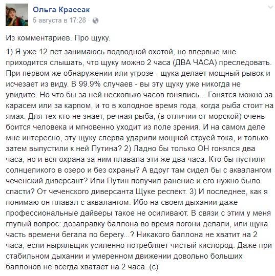 Естественно, всю неделю в телевизоре Путин. «Путин выпустил в Байкал 50 тысяч мальков омуля!», - ликует телевизор. У телезрителя не могло остаться никаких сомнений в том, что именно при личном участии российского президента эти юные омули появились на свет. Сразу после этого после этого сюжета на экране появляется ветеран из Бурятии Голощапов, у которого одна только просьба к Путину: чтобы он на будущих выборах снова баллотировался. Путин сказал, что подумает. У страны отлегло. Главный сюжет недели – Путин и щука. Если судить по российским медиа, то подвиг Путина в битве со щукой намного превосходит по масштабам тот, что совершил кубинский рыбак Сантьяго, воспетый Хемингуэем, и вполне сопоставим с битвой с морским чудовищем Моби Диком из одноименного романа Мелвилла. Путинская щука, может и чуть меньше пятиметрового марлина, и явно худее 26-метрового кашалота, но наверняка хитрее и кровожаднее их обоих. Кстати, тут поэт Быков недавно предложил всем российским писателям написать для Путина книгу, после которой российский диктатор немедленно подобреет и повернет страну в сторону мира, прогресса и процветания.