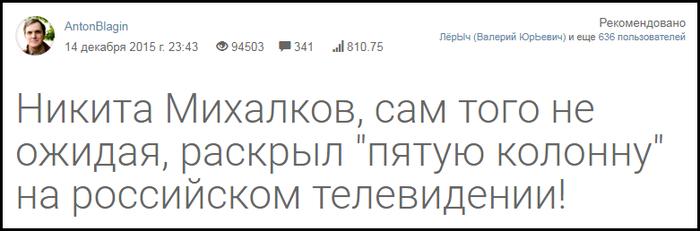 Это говорит прежде всего о том, что Никита Михалков, сам того не ожидая, раскрыл существование на российском телевидении «ПЯТОЙ КОЛОННЫ», которая показала, что, во-первых, она является ВЛАСТЬ ИМУЩЕЙ, (она может что-то запрещать), а во-вторых, она показала, что никакой критики на ТВ в адрес своих членов она не допустит!